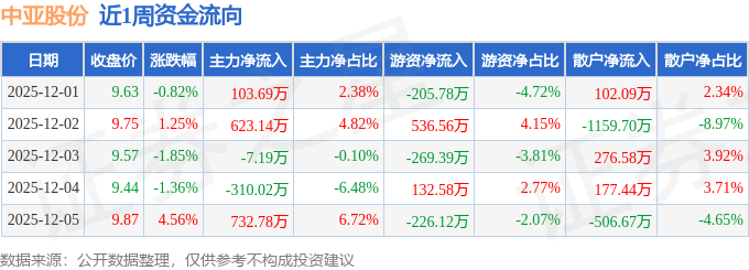资金流向数据方面,本周中亚股份主力资金合计净流入1142.41万元,游资资金合计净流出32.15万元,散户资金合计净流出1110.26万元。本周资金流向一览见下表: