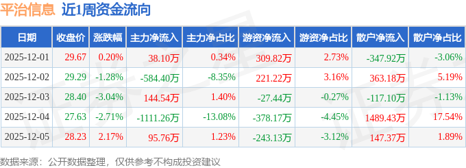 资金流向数据方面,本周平治信息主力资金合计净流出1417.25万元,游资资金合计净流出117.7万元,散户资金合计净流入1534.95万元。本周资金流向一览见下表: