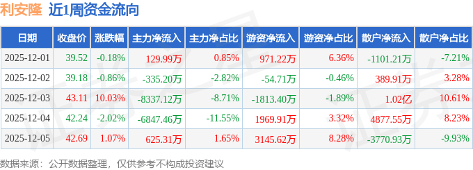 资金流向数据方面,本周利安隆主力资金合计净流出1.48亿元,游资资金合计净流入4218.64万元,散户资金合计净流入1.05亿元。本周资金流向一览见下表: