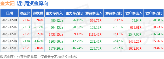 资金流向数据方面,本周金太阳主力资金合计净流出2136.76万元,游资资金合计净流入1106.87万元,散户资金合计净流入1029.89万元。本周资金流向一览见下表: