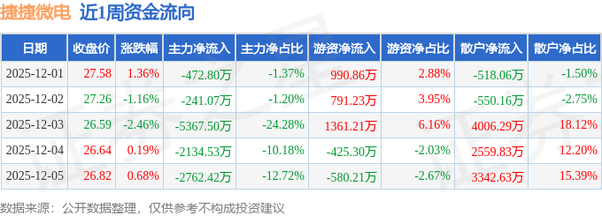 资金流向数据方面,本周捷捷微电主力资金合计净流出1.1亿元,游资资金合计净流入2137.79万元,散户资金合计净流入8840.53万元。本周资金流向一览见下表: