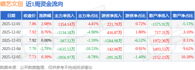 资金流向数据方面,本周德艺文创主力资金合计净流出3659.86万元,游资资金合计净流出1099.58万元,散户资金合计净流入4759.44万元。本周资金流向一览见下表: