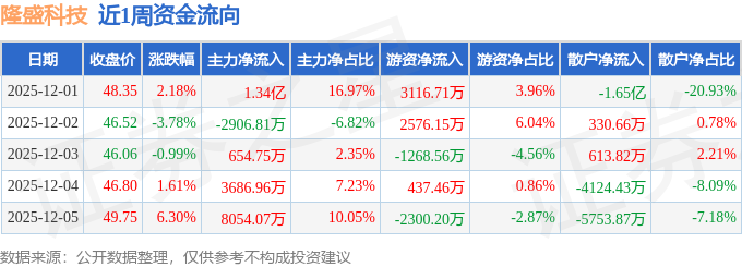 资金流向数据方面,本周隆盛科技主力资金合计净流入2.28亿元,游资资金合计净流入2561.56万元,散户资金合计净流出2.54亿元。本周资金流向一览见下表: