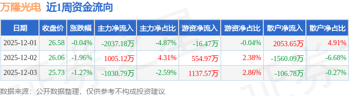 资金流向数据方面,本周万隆光电主力资金合计净流出2062.85万元,游资资金合计净流入1676.07万元,散户资金合计净流入386.78万元。本周资金流向一览见下表: