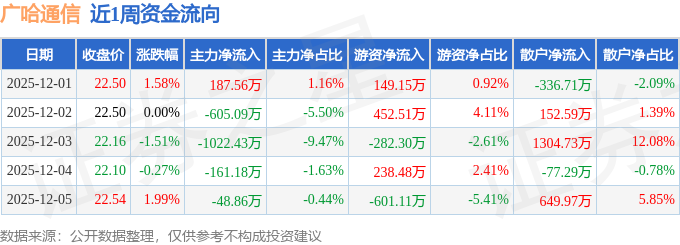 资金流向数据方面,本周广哈通信主力资金合计净流出1650.01万元,游资资金合计净流出43.27万元,散户资金合计净流入1693.27万元。本周资金流向一览见下表: