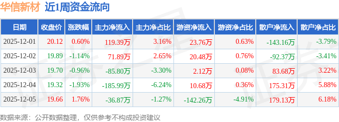 资金流向数据方面,本周华信新材主力资金合计净流出117.38万元,游资资金合计净流出85.21万元,散户资金合计净流入202.59万元。本周资金流向一览见下表: