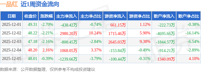 资金流向数据方面,本周一品红主力资金合计净流入1569.73万元,游资资金合计净流入4767.35万元,散户资金合计净流出6337.08万元。本周资金流向一览见下表: