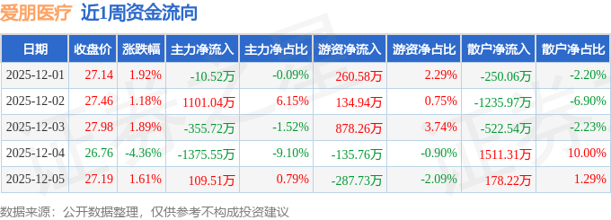 资金流向数据方面,本周爱朋医疗主力资金合计净流出531.24万元,游资资金合计净流入850.29万元,散户资金合计净流出319.05万元。本周资金流向一览见下表: