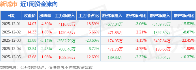 资金流向数据方面,本周新城市主力资金合计净流入2326.09万元,游资资金合计净流入251.71万元,散户资金合计净流出2577.8万元。本周资金流向一览见下表: