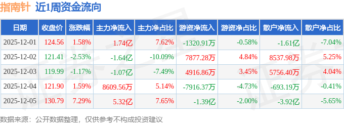 资金流向数据方面,本周指南针主力资金合计净流入5.21亿元,游资资金合计净流出1.04亿元,散户资金合计净流出4.17亿元。本周资金流向一览见下表: