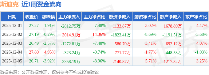 资金流向数据方面,本周斯迪克主力资金合计净流出4752.09万元,游资资金合计净流入2803.81万元,散户资金合计净流入1948.29万元。本周资金流向一览见下表: