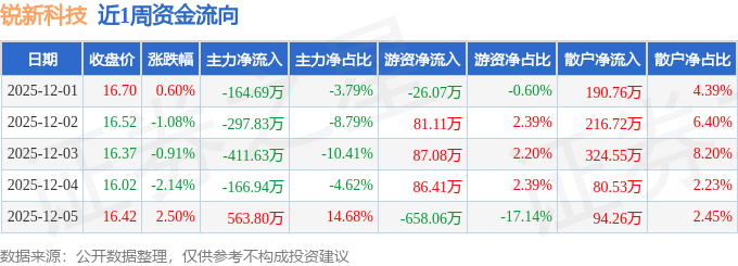 资金流向数据方面,本周锐新科技主力资金合计净流出477.29万元,游资资金合计净流出429.52万元,散户资金合计净流入906.82万元。本周资金流向一览见下表: