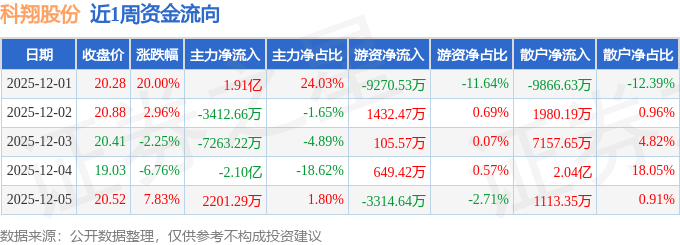 资金流向数据方面,本周科翔股份主力资金合计净流出1.04亿元,游资资金合计净流出1.04亿元,散户资金合计净流入2.08亿元。本周资金流向一览见下表: