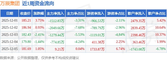 资金流向数据方面,本周万辰集团主力资金合计净流出5607.56万元,游资资金合计净流出730.08万元,散户资金合计净流入6337.64万元。本周资金流向一览见下表:
