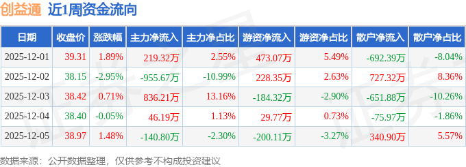 资金流向数据方面,本周创益通主力资金合计净流入5.25万元,游资资金合计净流入346.77万元,散户资金合计净流出352.02万元。本周资金流向一览见下表: