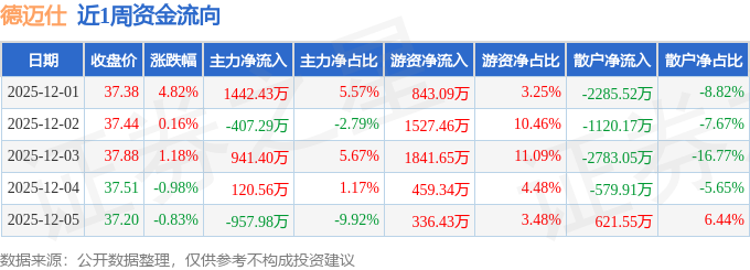 资金流向数据方面,本周德迈仕主力资金合计净流入1139.12万元,游资资金合计净流入5007.98万元,散户资金合计净流出6147.1万元。本周资金流向一览见下表: