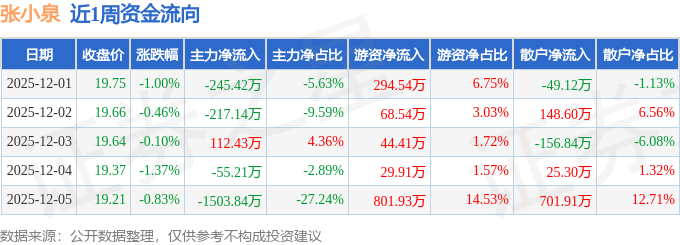 资金流向数据方面,本周张小泉主力资金合计净流出1909.17万元,游资资金合计净流入1239.33万元,散户资金合计净流入669.85万元。本周资金流向一览见下表: