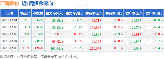 资金流向数据方面,本周严牌股份主力资金合计净流出181.51万元,游资资金合计净流入466.88万元,散户资金合计净流出285.38万元。本周资金流向一览见下表: