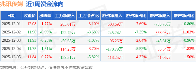 资金流向数据方面,本周兆讯传媒主力资金合计净流出15.5万元,游资资金合计净流入302.18万元,散户资金合计净流出286.68万元。本周资金流向一览见下表: