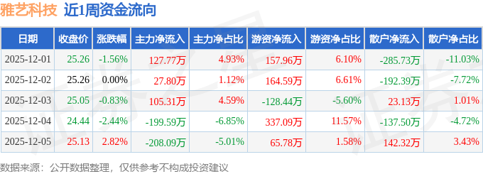 资金流向数据方面,本周雅艺科技主力资金合计净流出146.81万元,游资资金合计净流入596.98万元,散户资金合计净流出450.17万元。本周资金流向一览见下表: