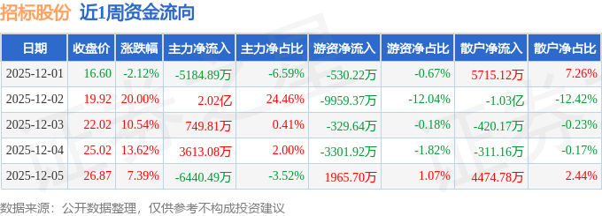 资金流向数据方面,本周招标股份主力资金合计净流入1.3亿元,游资资金合计净流出1.22亿元,散户资金合计净流出816.41万元。本周资金流向一览见下表: