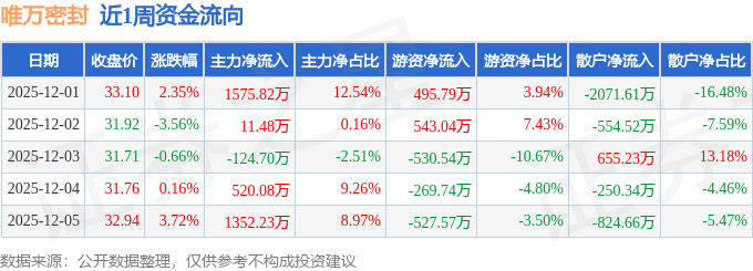 资金流向数据方面,本周唯万密封主力资金合计净流入3334.91万元,游资资金合计净流出289.02万元,散户资金合计净流出3045.9万元。本周资金流向一览见下表: