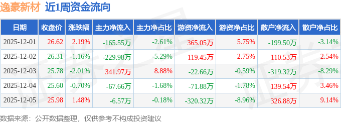 资金流向数据方面,本周逸豪新材主力资金合计净流出127.79万元,游资资金合计净流入69.65万元,散户资金合计净流入58.14万元。本周资金流向一览见下表: