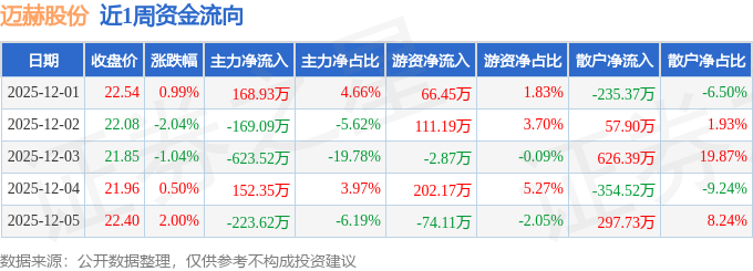 资金流向数据方面,本周迈赫股份主力资金合计净流出694.96万元,游资资金合计净流入302.84万元,散户资金合计净流入392.12万元。本周资金流向一览见下表: