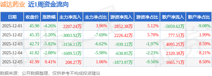 资金流向数据方面,本周诚达药业主力资金合计净流出5434.08万元,游资资金合计净流入1634.85万元,散户资金合计净流入3799.23万元。本周资金流向一览见下表: