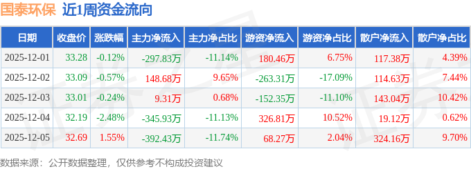 资金流向数据方面,本周国泰环保主力资金合计净流出878.21万元,游资资金合计净流入159.88万元,散户资金合计净流入718.32万元。本周资金流向一览见下表: