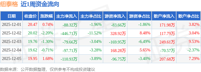 资金流向数据方面,本周纽泰格主力资金合计净流出823.34万元,游资资金合计净流入146.84万元,散户资金合计净流入676.5万元。本周资金流向一览见下表: