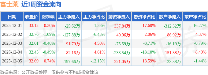 资金流向数据方面,本周富士莱主力资金合计净流出177.12万元,游资资金合计净流入290.71万元,散户资金合计净流出113.59万元。本周资金流向一览见下表: