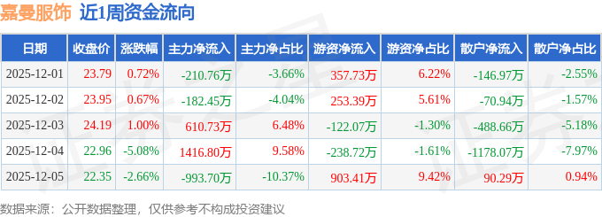 资金流向数据方面,本周嘉曼服饰主力资金合计净流入640.62万元,游资资金合计净流入1153.74万元,散户资金合计净流出1794.36万元。本周资金流向一览见下表: