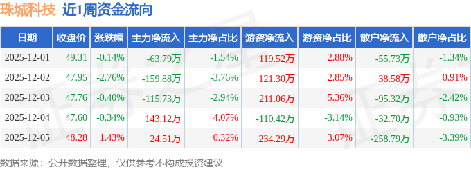 资金流向数据方面,本周珠城科技主力资金合计净流出171.78万元,游资资金合计净流入575.74万元,散户资金合计净流出403.96万元。本周资金流向一览见下表: