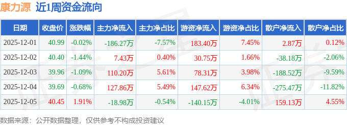 资金流向数据方面,本周康力源主力资金合计净流入40.25万元,游资资金合计净流入299.92万元,散户资金合计净流出340.17万元。本周资金流向一览见下表: