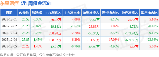 资金流向数据方面,本周东星医疗主力资金合计净流入424.97万元,游资资金合计净流入252.59万元,散户资金合计净流出677.55万元。本周资金流向一览见下表: