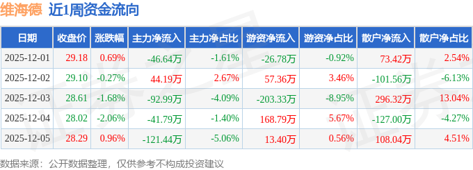 资金流向数据方面,本周维海德主力资金合计净流出258.67万元,游资资金合计净流入9.44万元,散户资金合计净流入249.23万元。本周资金流向一览见下表: