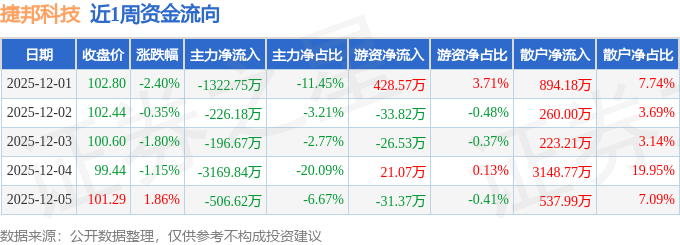 资金流向数据方面,本周捷邦科技主力资金合计净流出5422.06万元,游资资金合计净流入357.92万元,散户资金合计净流入5064.14万元。本周资金流向一览见下表: