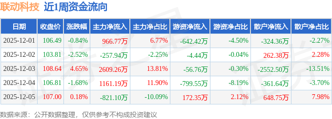 资金流向数据方面,本周联动科技主力资金合计净流入3658.18万元,游资资金合计净流出1330.81万元,散户资金合计净流出2327.38万元。本周资金流向一览见下表: