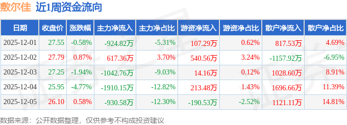 资金流向数据方面,本周敷尔佳主力资金合计净流出4190.95万元,游资资金合计净流入684.96万元,散户资金合计净流入3505.99万元。本周资金流向一览见下表: