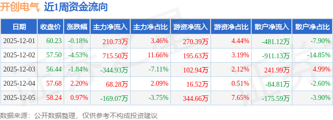 资金流向数据方面,本周开创电气主力资金合计净流入480.51万元,游资资金合计净流入930.15万元,散户资金合计净流出1410.66万元。本周资金流向一览见下表: