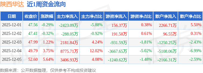资金流向数据方面,本周陕西华达主力资金合计净流入1.17亿元,游资资金合计净流出5491.99万元,散户资金合计净流出6161.36万元。本周资金流向一览见下表: