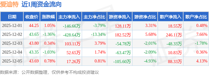 资金流向数据方面,本周爱迪特主力资金合计净流出402.28万元,游资资金合计净流入86.79万元,散户资金合计净流入315.49万元。本周资金流向一览见下表: