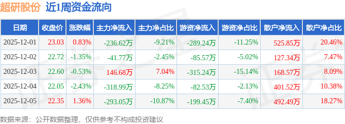 资金流向数据方面,本周超研股份主力资金合计净流出743.74万元,游资资金合计净流出972.02万元,散户资金合计净流入1715.77万元。本周资金流向一览见下表: