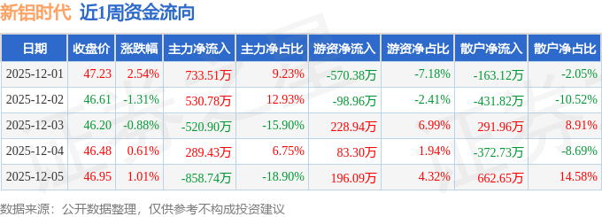 资金流向数据方面,本周新铝时代主力资金合计净流入174.08万元,游资资金合计净流出161.01万元,散户资金合计净流出13.07万元。本周资金流向一览见下表: