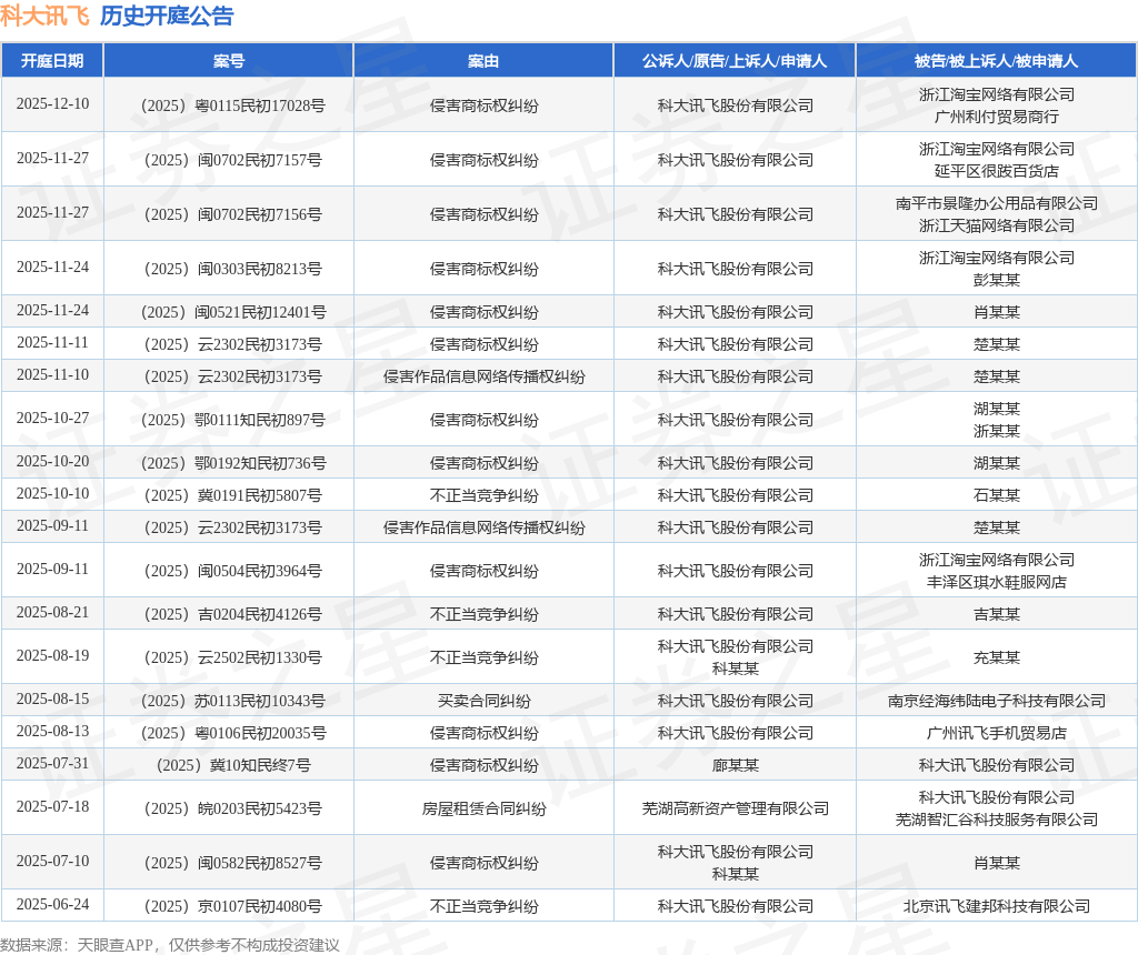 案号:(2025)粤0115民初17028号根据统计,近一年内以科大讯飞股份有限公司为当事人的历史开庭公告有47则,其中案由为“侵害商标权纠纷”的公告以27则居首,其次为“不正当竞争纠纷”有7则,“侵害作品信息网络传播权纠纷”有3则。历史开庭公告(前20条)如下: