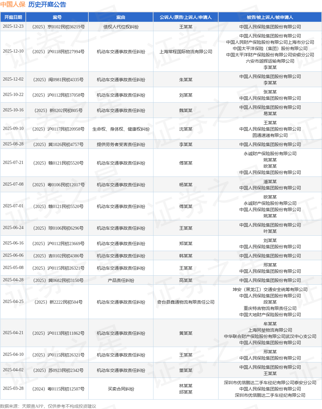 案号:(2025)沪0118民初27994号根据统计,近一年内以中国人民保险集团股份有限公司为当事人的历史开庭公告有28则,其中案由为“机动车交通事故责任纠纷”的公告以18则居首,其次为“买卖合同纠纷”有3则,“交通事故”有1则。历史开庭公告(前20条)如下: