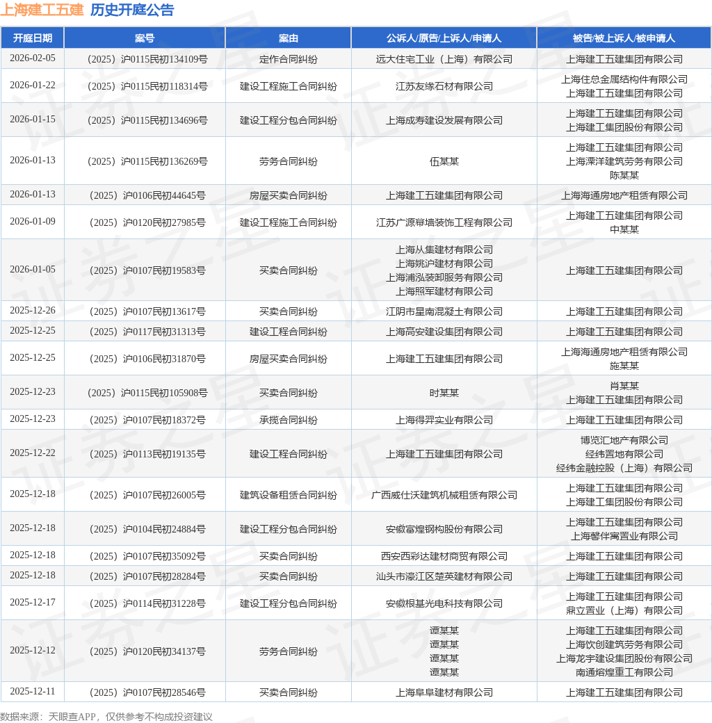 案号:(2025)沪0107民初30545号根据统计,近一年内以上海建工五建集团有限公司为当事人的历史开庭公告有297则,其中案由为“建设工程分包合同纠纷”的公告以57则居首,其次为“建设工程施工合同纠纷”有53则,“买卖合同纠纷”有36则。历史开庭公告(前20条)如下: