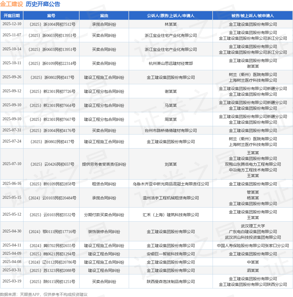 案号:(2025)浙1004民初7512号根据统计,近一年内以金工建设集团股份有限公司为当事人的历史开庭公告有27则,其中案由为“建设工程施工合同纠纷”的公告以7则居首,其次为“买卖合同纠纷”有6则,“建设工程分包合同纠纷”有3则。历史开庭公告(前20条)如下: