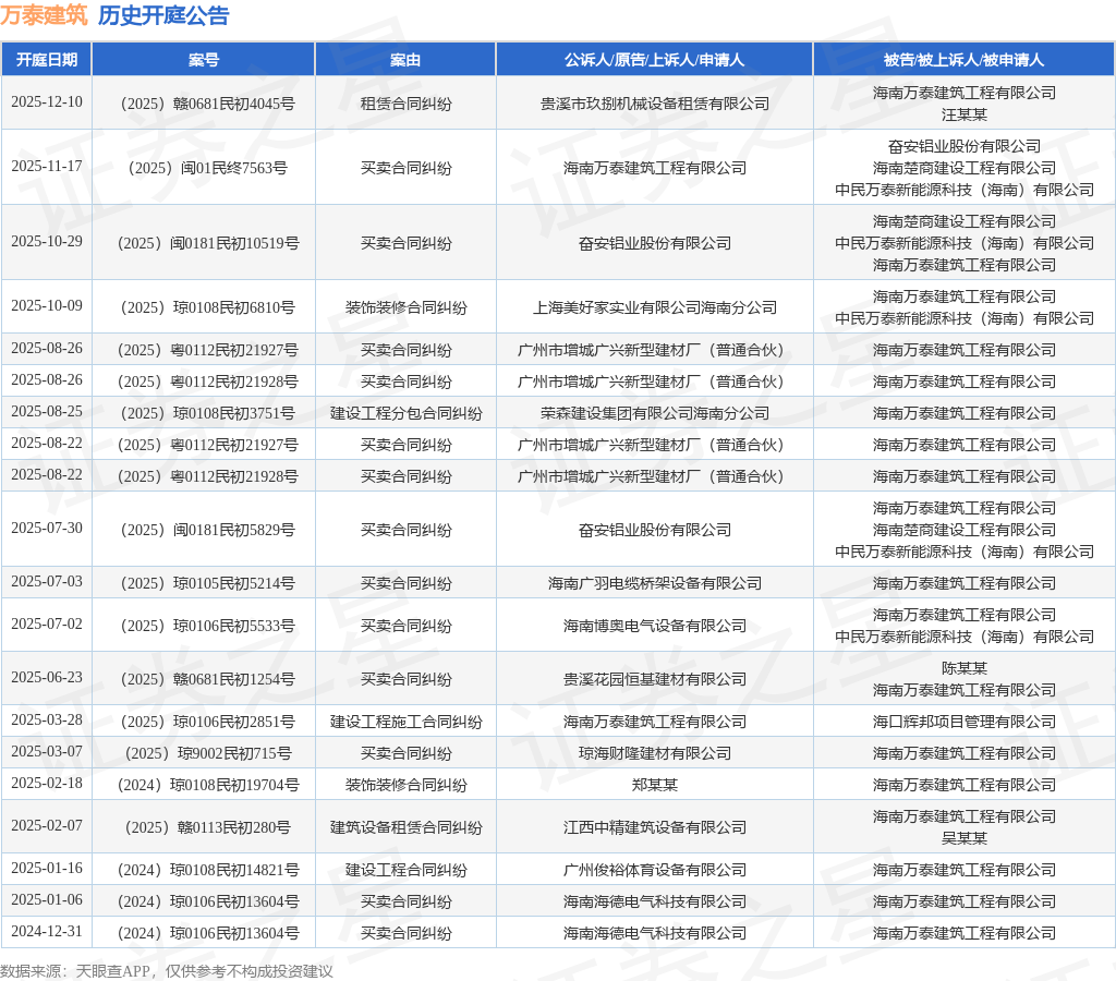 案号:(2025)赣0681民初4045号根据统计,近一年内以海南万泰建筑工程有限公司为当事人的历史开庭公告有21则,其中案由为“买卖合同纠纷”的公告以14则居首,其次为“装饰装修合同纠纷”有2则,“建筑设备租赁合同纠纷”有1则。历史开庭公告(前20条)如下: